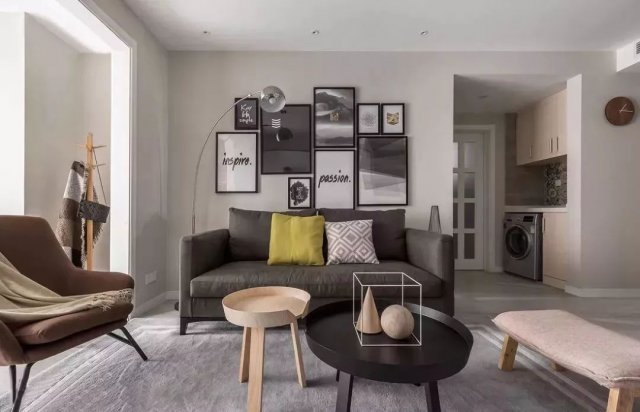 客厅里大面积的木调立面令空间显得温暖,白色布艺沙发和三角形白色与黄色组合茶几倾诉着简约时尚,铁艺球泡灯和黑白地毯多人眼球,唱响了黑白双色的艺术魅力。