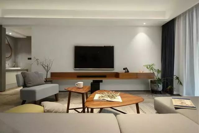 原木地面与木色家具形成温和的调性,木质边柜和悬挂柜与主题相统一;不锈钢烤漆灯笼吊灯添置了工业元素,强烈的时尚感和空间的暖调形成和煦之风,并白色镂空屏风形成对比,凝结出混搭的艺术。